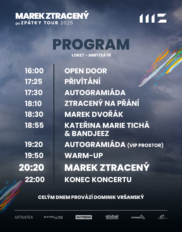 Vstupem na akci MAREK ZTRACENÝ (je) ZPÁTKY TOUR souhlasíte s tím, že se můžete objevit na záznamech (včetně záběrů z dronu), které budou použity pro dokumentaci a propagaci tour. Nebojte ale žádné paparazzi v keřích! Je to tým, který chce uchovat ty nejlepší vzpomínky! Takže pokud chceš být právě ty hvězdou našich sociálních sítí a příštího aftermovie, tak mávej, tleskej, zpívej a užívej, co to dá!